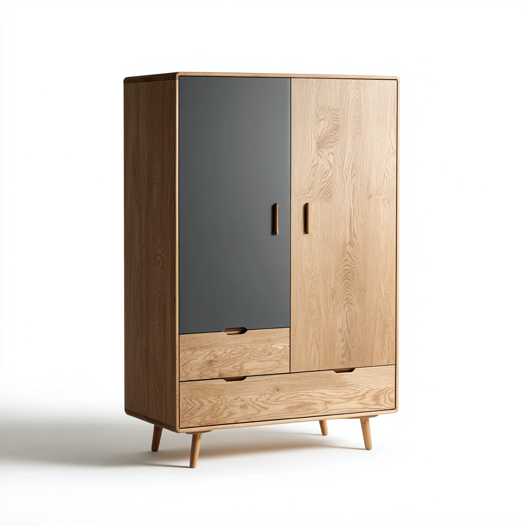 Questo armadio combina legno naturale e anta in grigio scuro, creando un contrasto moderno ed elegante. Le linee pulite e la struttura solida lo rendono ideale per camere da letto in stile contemporaneo.