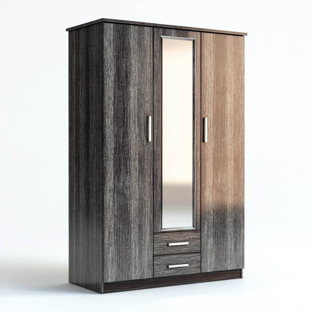 Questo armadio moderno unisce tonalità grigio scuro e legno naturale, creando un effetto visivo elegante e contemporaneo. La superficie a specchio integrata dona luminosità e praticità, risultando ideale per camere da letto dal design attuale.