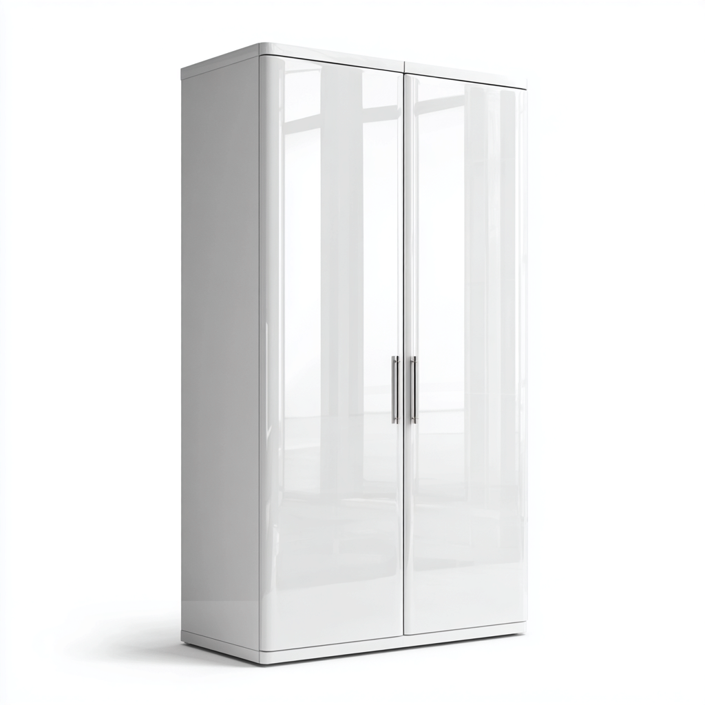 Questo armadio con finitura lucida presenta un aspetto elegante e minimale, ideale per ambienti moderni che richiedono ordine e luminosità.