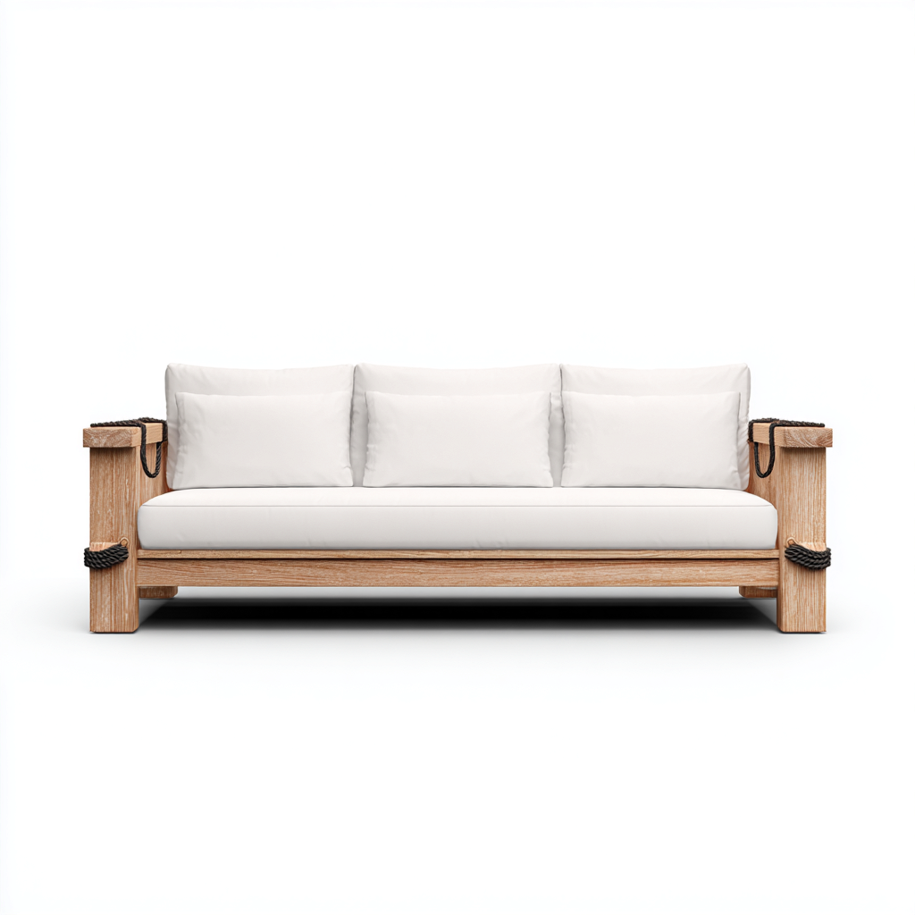 Questo divano da esterno a tre posti combina materiali naturali e un design moderno, offrendo una soluzione elegante e confortevole per terrazze e giardini.