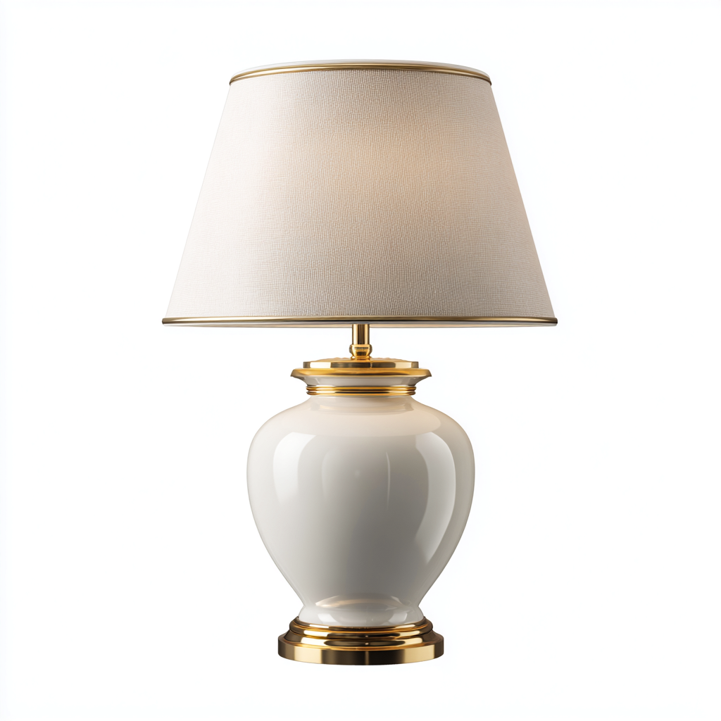 La base in ceramica presenta una superficie liscia e lucida. I dettagli metallici dorati conferiscono un tocco raffinato, mentre il paralume in tessuto beige assicura una diffusione morbida e uniforme della luce.