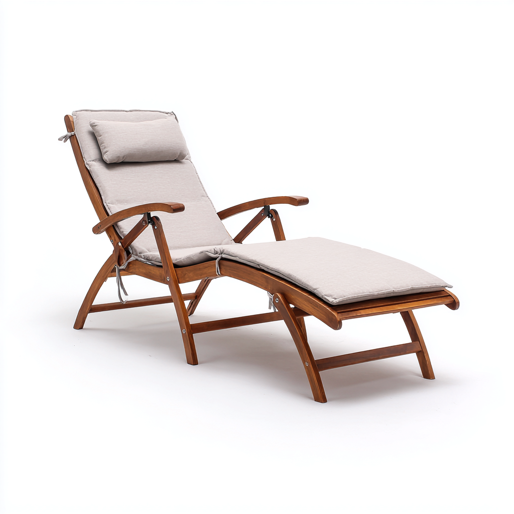Questo lettino da sole in legno naturale con cuscino imbottito beige offre una combinazione equilibrata di estetica e comfort, ideale per giardini, terrazze e altre aree outdoor. Le linee morbide e la struttura ergonomica contribuiscono a creare un ambiente di relax elegante.