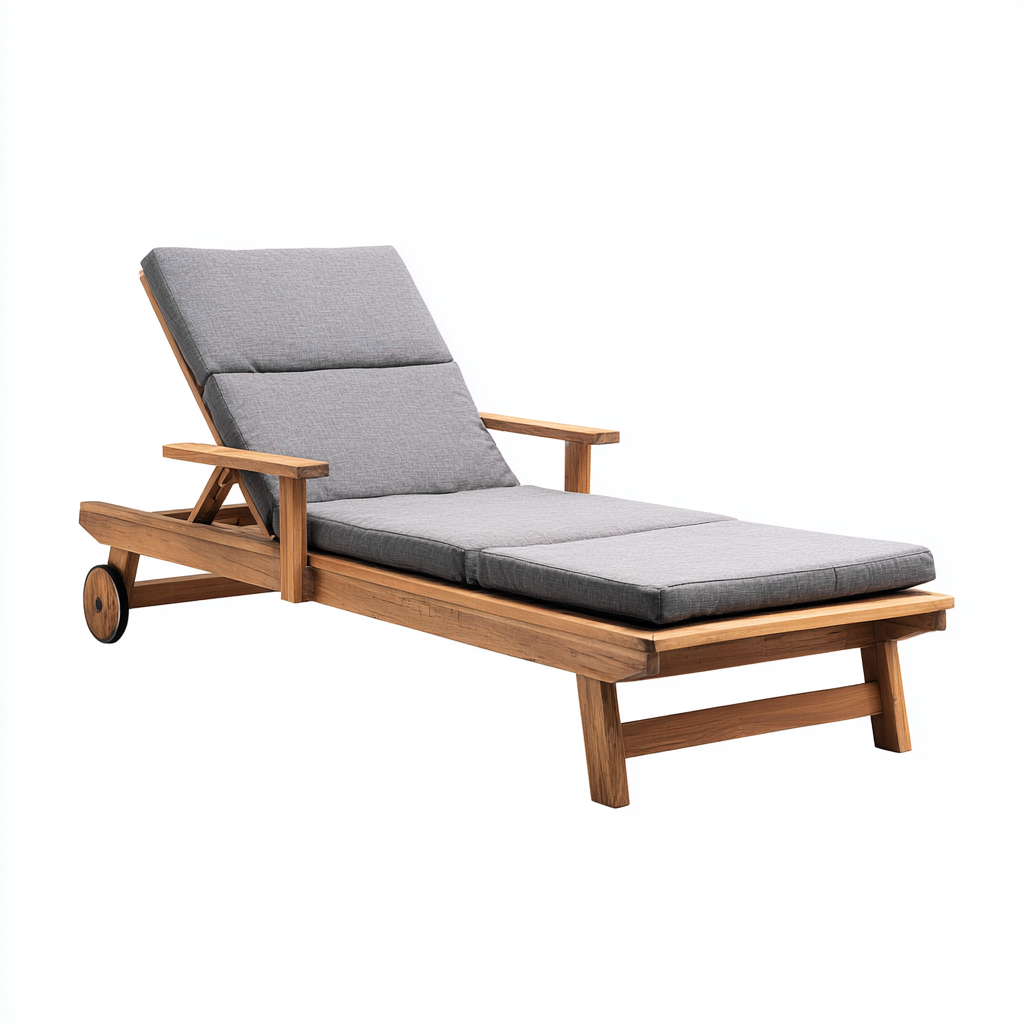 La struttura è realizzata interamente in legno con finitura naturale, adatta all'uso esterno e resistente nel tempo. Il cuscino imbottito grigio offre una seduta morbida e confortevole. Le ruote posteriori facilitano lo spostamento quando necessario.