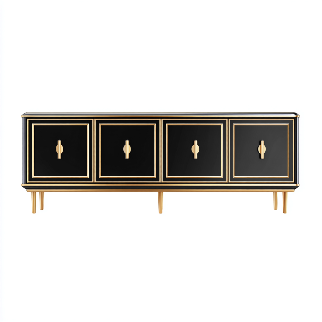 Realizzato in legno composito con superficie nera lucida e cornici decorative dorate. Le gambe e le maniglie dorate aggiungono stabilità e un tocco estetico moderno.