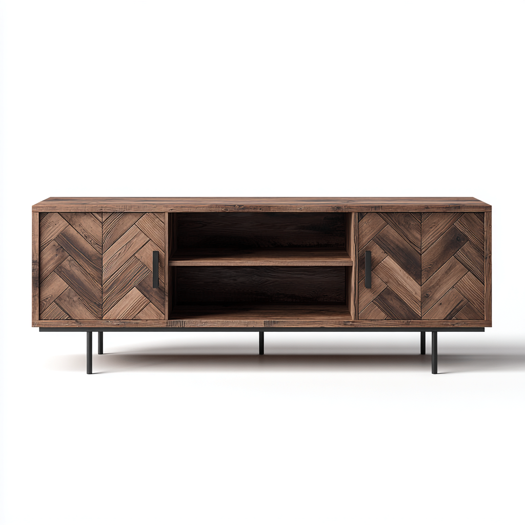Questo mobile TV in stile industriale combina legno finitura noce con una struttura in metallo nero, creando un aspetto equilibrato e robusto. Le ante con motivo a spina di pesce aggiungono profondità visiva e un carattere artigianale che valorizza l'estetica dell'arredo.