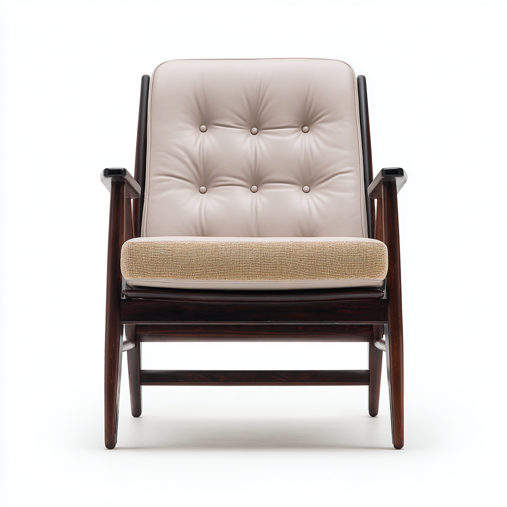La combinazione di pelle e tessuto garantisce comfort e sostegno. I braccioli in legno offrono un appoggio stabile, mentre la seduta leggermente inclinata favorisce una postura rilassata.