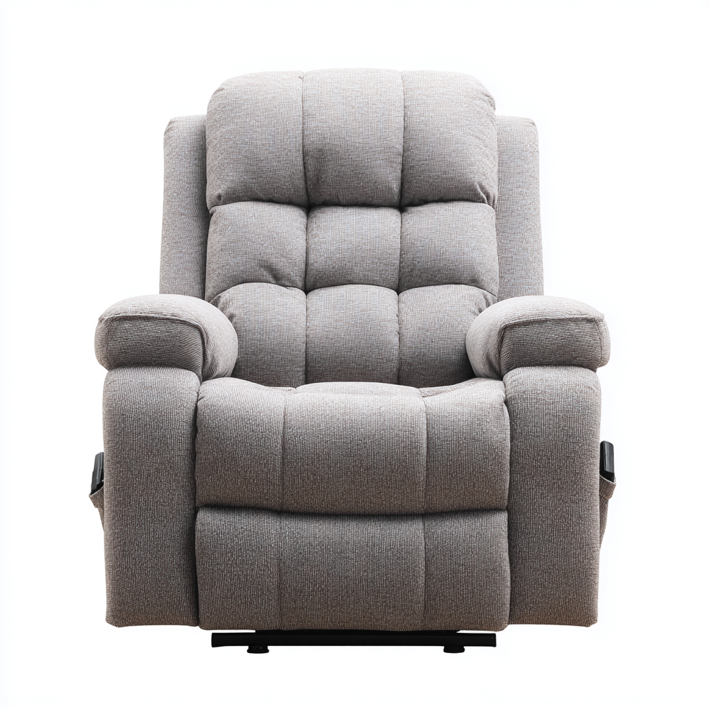 Questa poltrona reclinabile in tessuto grigio offre una seduta ampia e confortevole grazie all'imbottitura generosa e al sostegno uniforme.