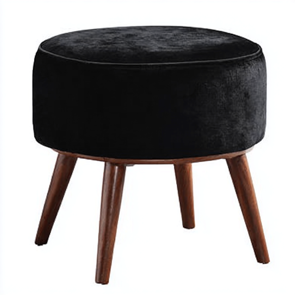 La seduta è realizzata in velluto di alta qualità, piacevole al tatto e resistente all'uso quotidiano. La base è realizzata in legno naturale con finitura liscia, garantendo stabilità e un contrasto visivo raffinato rispetto al rivestimento scuro.