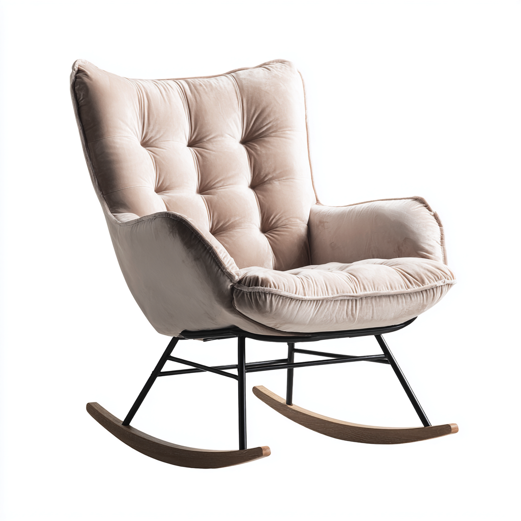 Questa sedia a dondolo moderna presenta una morbida seduta in velluto beige con imbottitura generosa, offrendo un comfort eccellente per il soggiorno o l'area relax.