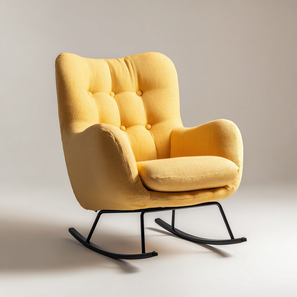 Questa sedia a dondolo in tessuto giallo offre un design moderno e confortevole, ideale per soggiorno, camera da letto o area relax.
