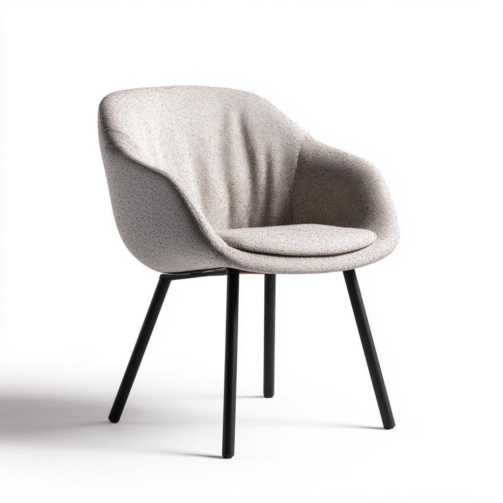 La scocca rivestita in tessuto beige presenta una superficie morbida e gradevole al tatto. Le gambe in metallo verniciato offrono resistenza e stabilità durante l'uso quotidiano.