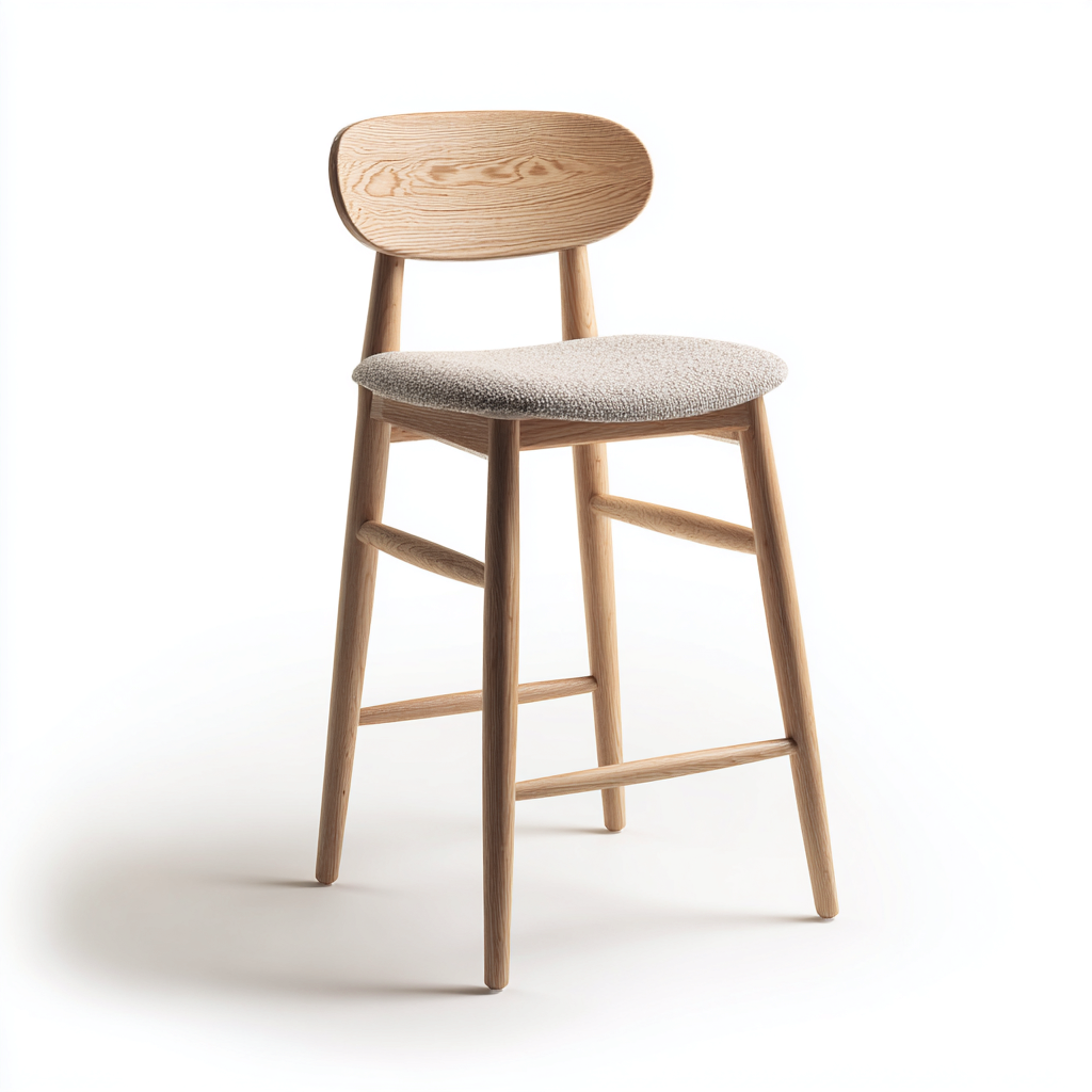 Sgabello da bar in stile nordico con struttura in legno naturale e seduta imbottita rivestita in tessuto beige, ideale per cucine con isola e ambienti moderni.